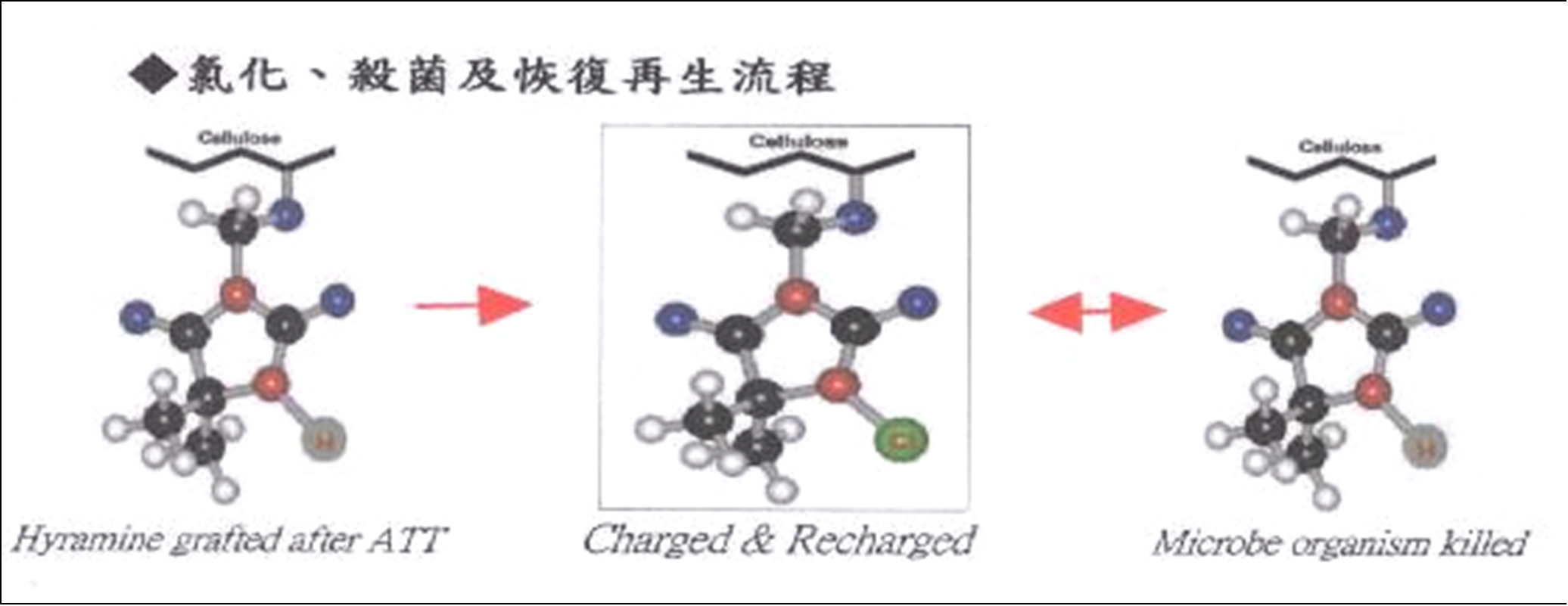 殺菌纖維的N-H殺菌鍵,經過氯漂方式結合氯離子,轉變成更強效的N-CL殺菌鍵,能更快速殺滅細菌,其中CL就會附到細菌的細胞壁上將細菌快速殺死,而化合物在作用後又變回N-H殺菌鍵,所以具備了可經重複氯漂再增生殺菌的功能。